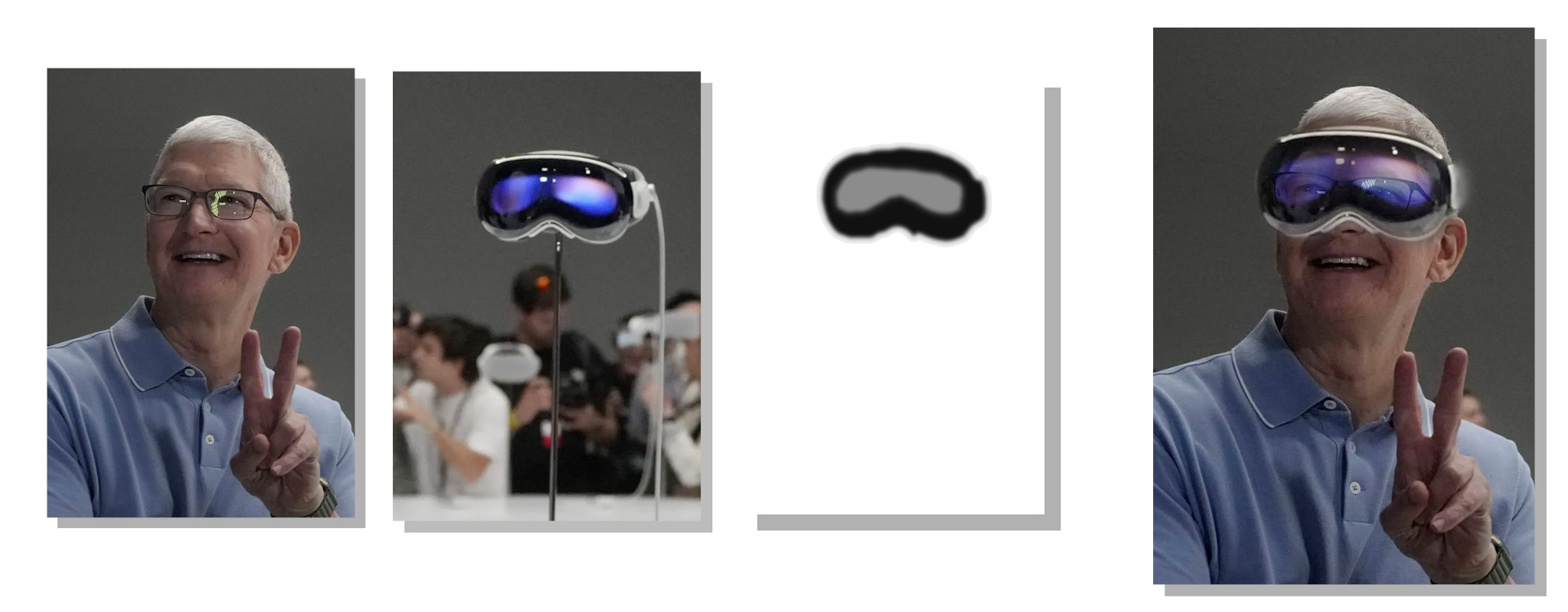 I also created another blend of Tim Cook wearing the Apple Vision Pro. I created the mask to be of the VR headset and aligned both images to layered the headset over his face (however the rotation of the headset in the image is not perfectly aligned with his face, but the effect is still visible). Since the Apple Vision Pro has a front facing 3D display to give the effect of seeing the person’s eyes through the headset, I wanted to simulate/experiment with this effect by not binarizing the mask and making it less dark on the eye part of the headset. This way, the frame of the headset would be opaque while the front eye display will be transparent. Therefore both images will be composited and blended in the center part of the headset to give the effect of seeing his face through the headset.