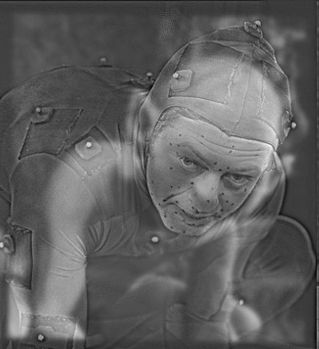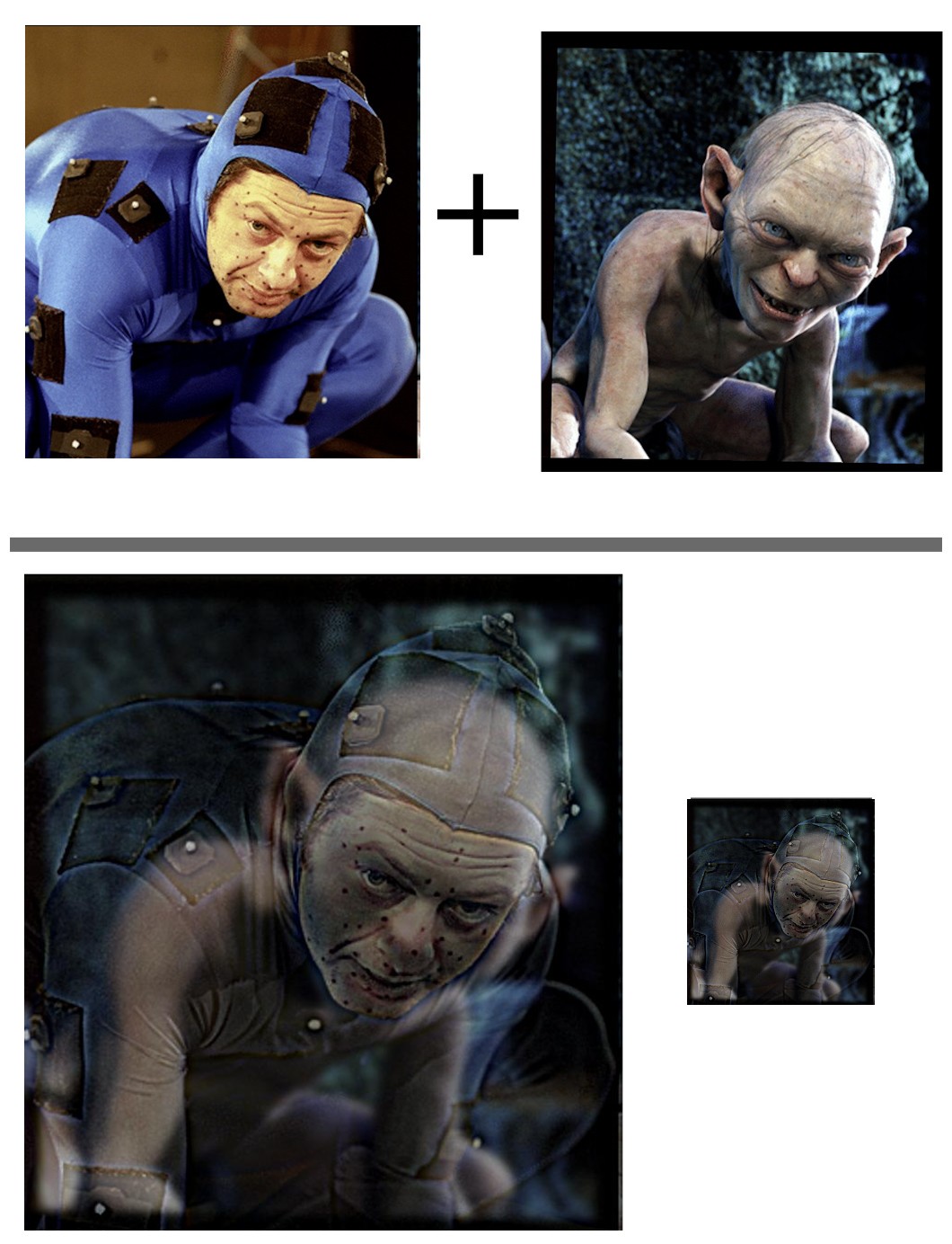 My favorite example I created is a hybrid image containing Andy Serkis in a performance capture suit and the digital character he plays, Gollum. I believe that these images are a good fit for a hybrid image since they retain a similar structure and facial features across each image. By keeping Serkis’ high frequencies and adding them to Gollum’s low frequencies, we can achieve a hybrid image where upclose, we see Serkis’s performance (with his motion capture dots), and when we zoom out, we see Gollum. For all of my examples, I had to manually align, scale, and position the images so the hybrid effect would look good.