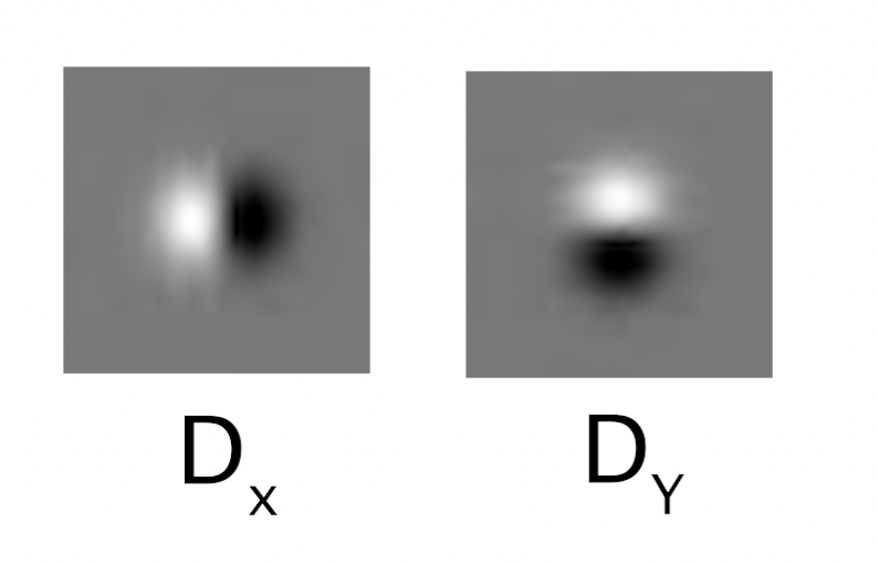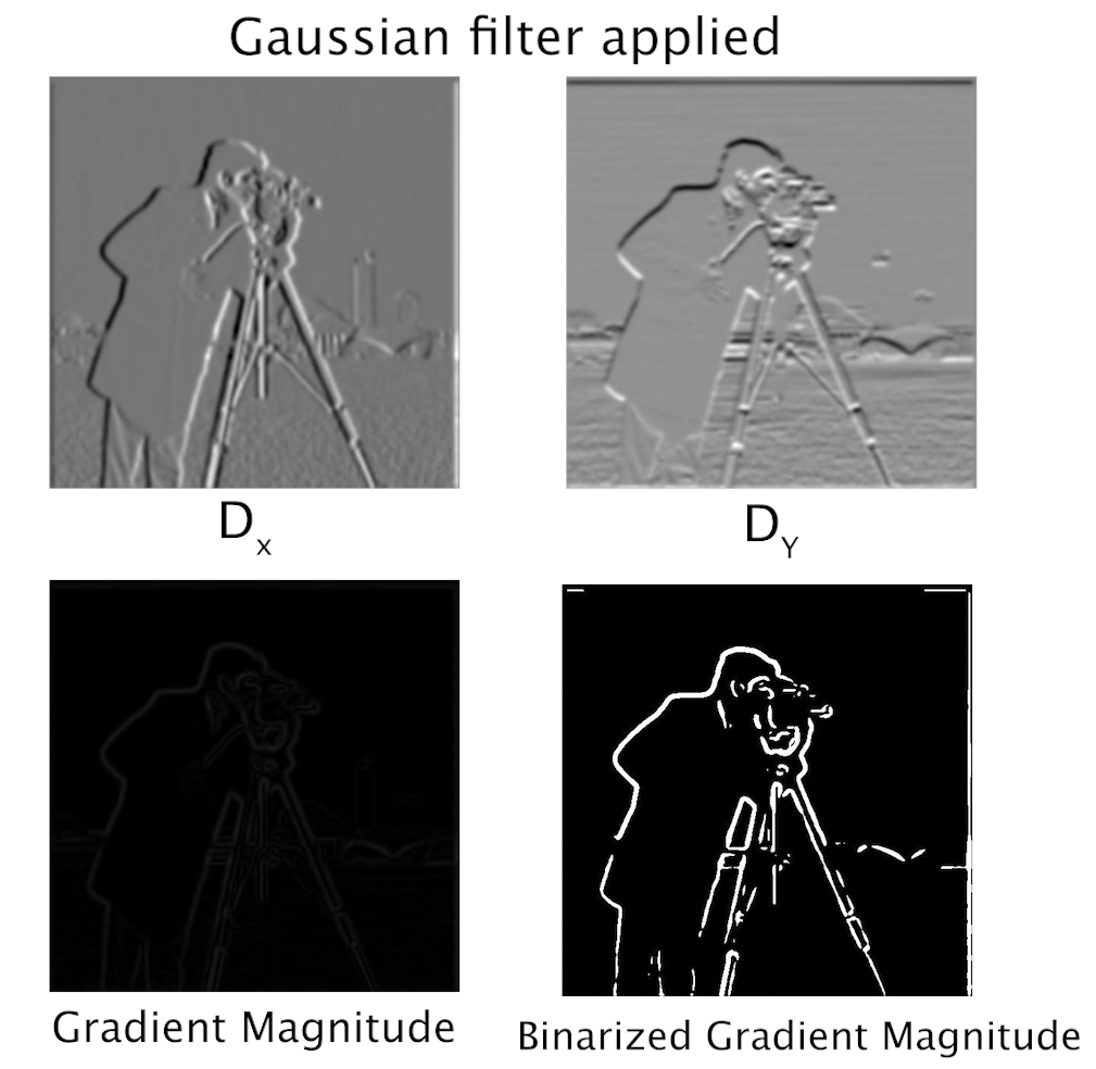 We can also use the derivative of the gaussian filter to achieve the same result. Convolving the D_x and D_Y operators with a gaussian gives us new filters. With these filters, we convolve them with the cameraman image to achieve the same results since the operation is commutative.