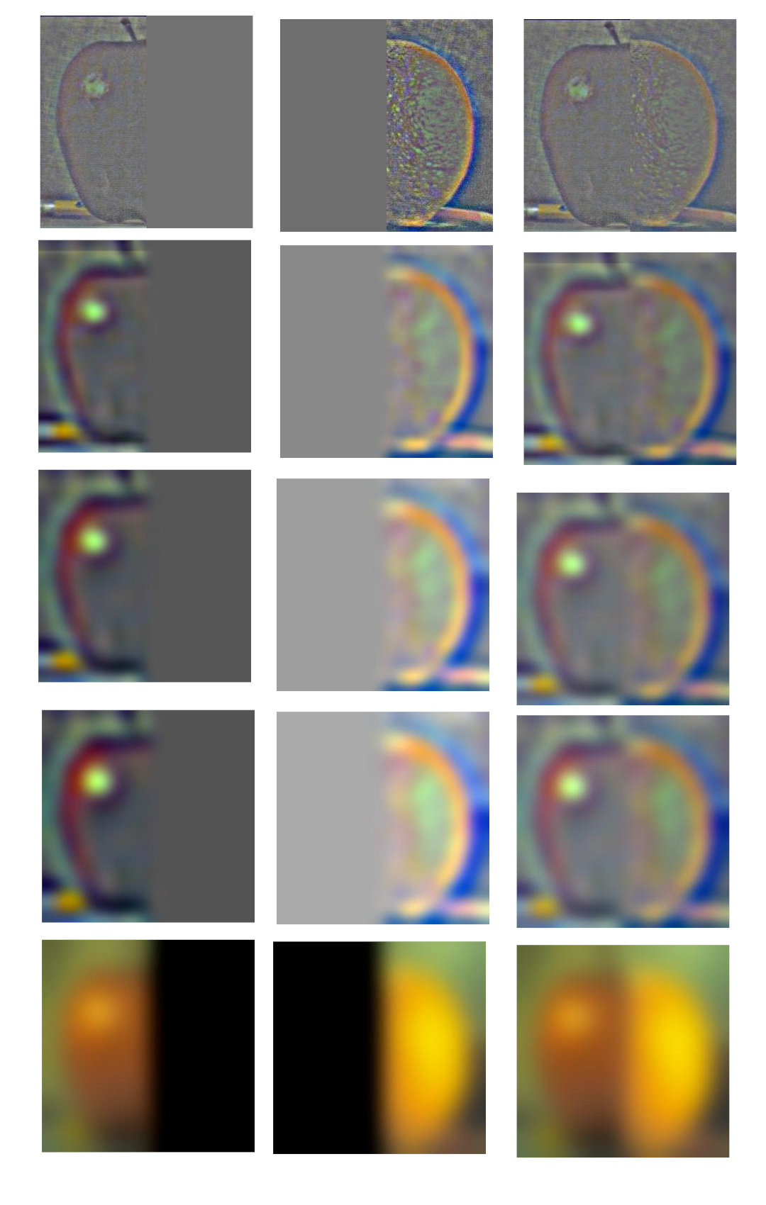 I have also recreated a Figure from Burt and Adelson’s A Multiresolution Spline With Application to Image Mosaics 1983 paper showing the laplacian stack to generate an “orapple” (combination of an apple and orange). I created a laplacian stack of 5 levels of the apple and orange with the mask applied.